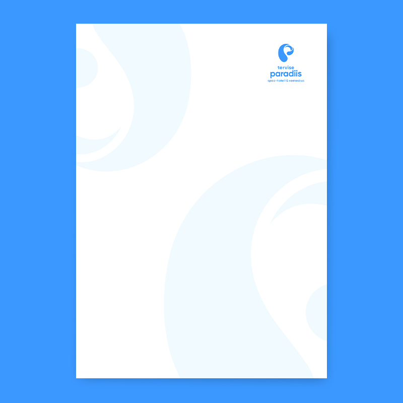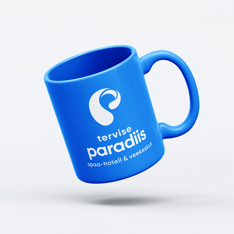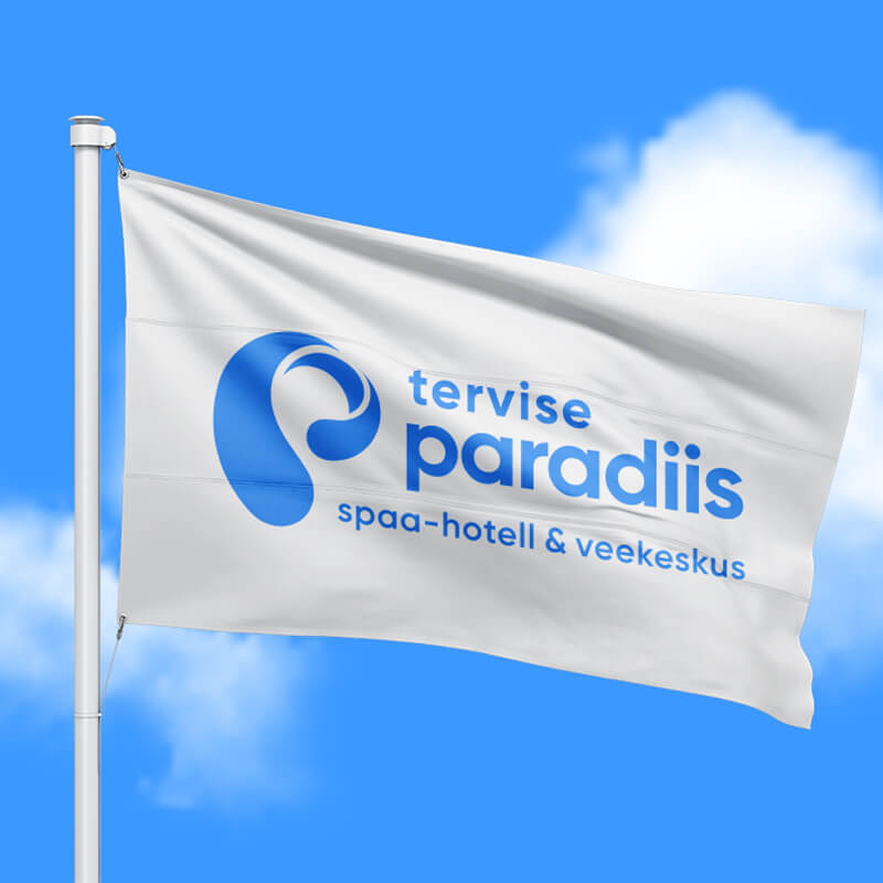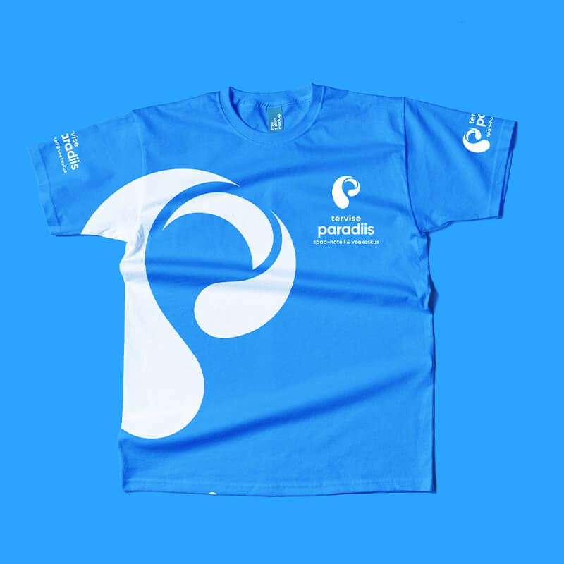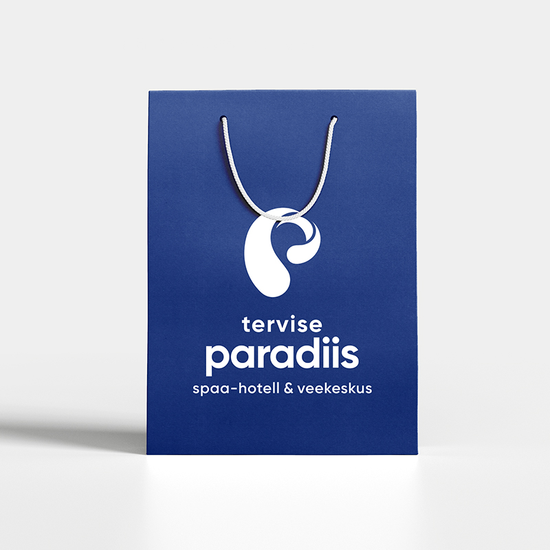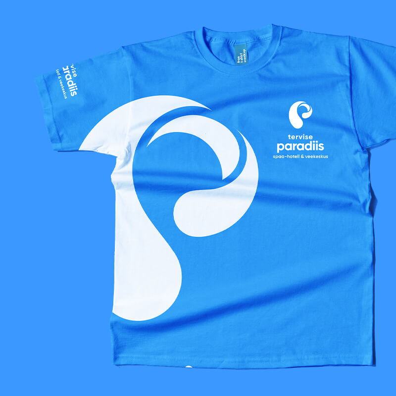 Tervise Paradiisi logo koosneb märgist ja tekstiblokist. Logo märk esitab p-tähe kujulist vee liikumist. Logo märk esitab p-tähe kujulist vee liikumist ja annab visuaalselt edasi veele omistatavaid selliseid omadusi nagu värskus, selgus, muutumine, tervis, erksusus, energia ja plastiline liikumine. Seda sõnumit toetab omalt poolt ka korporatiivsete värvide kasutus koos valgega.