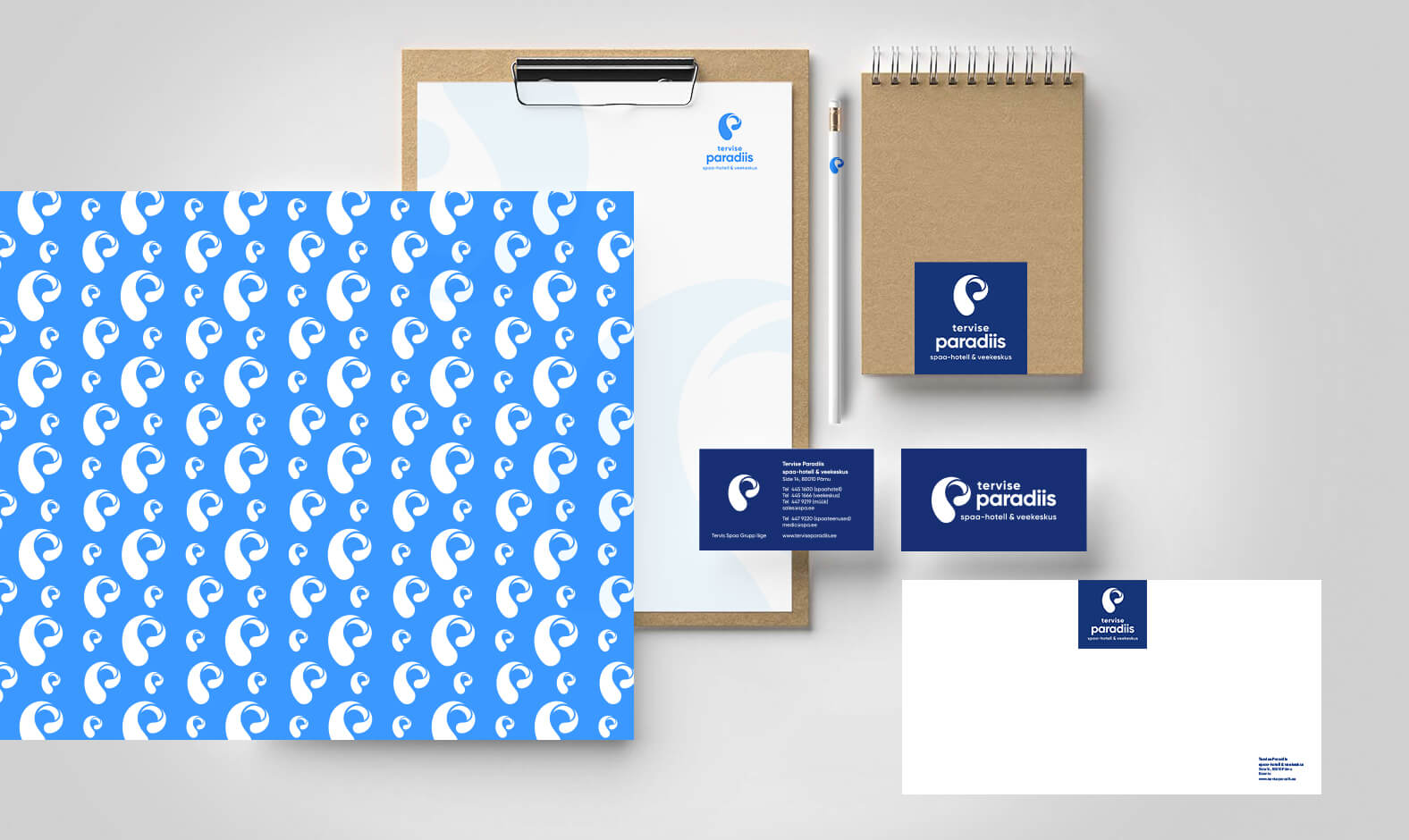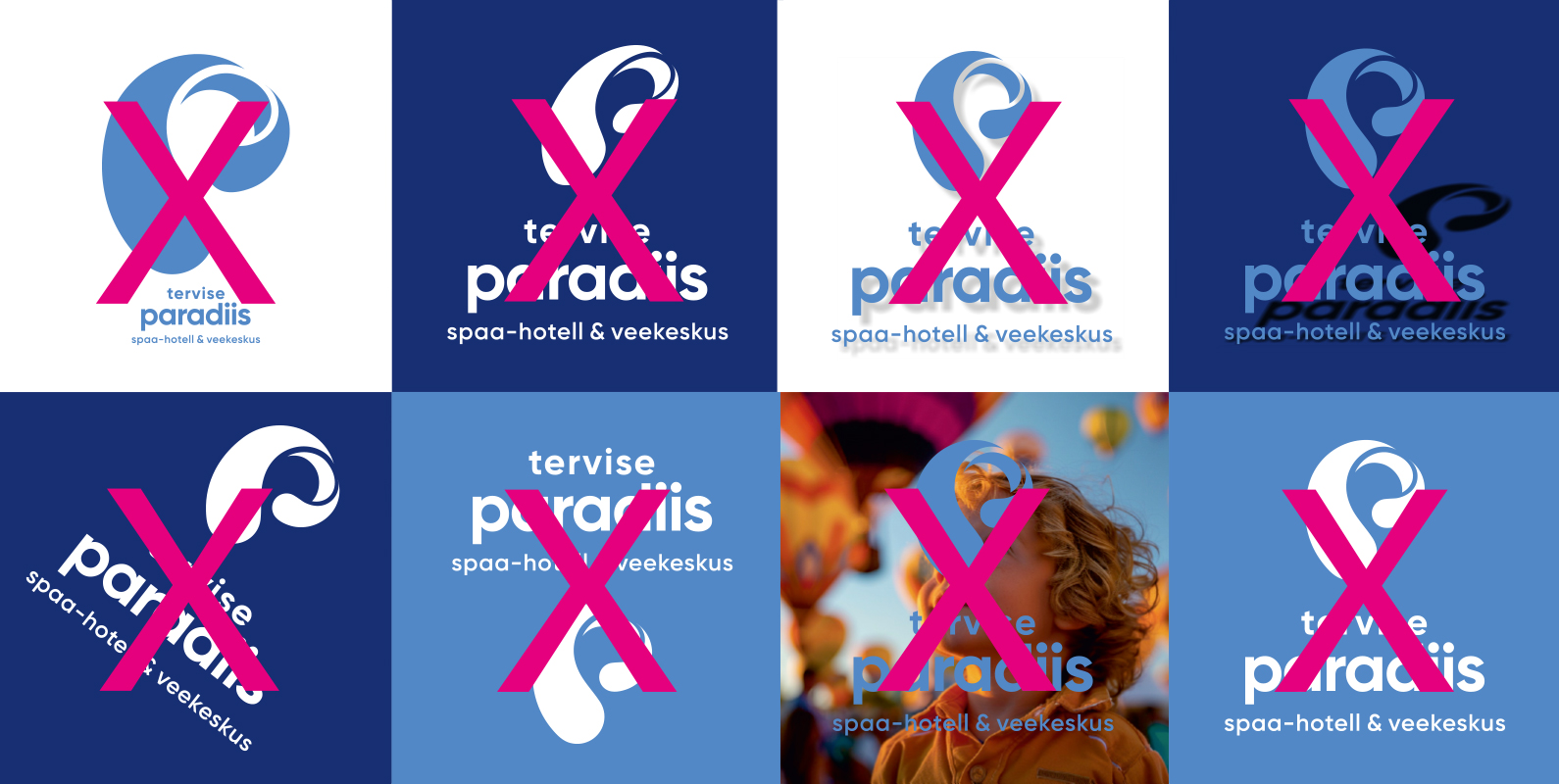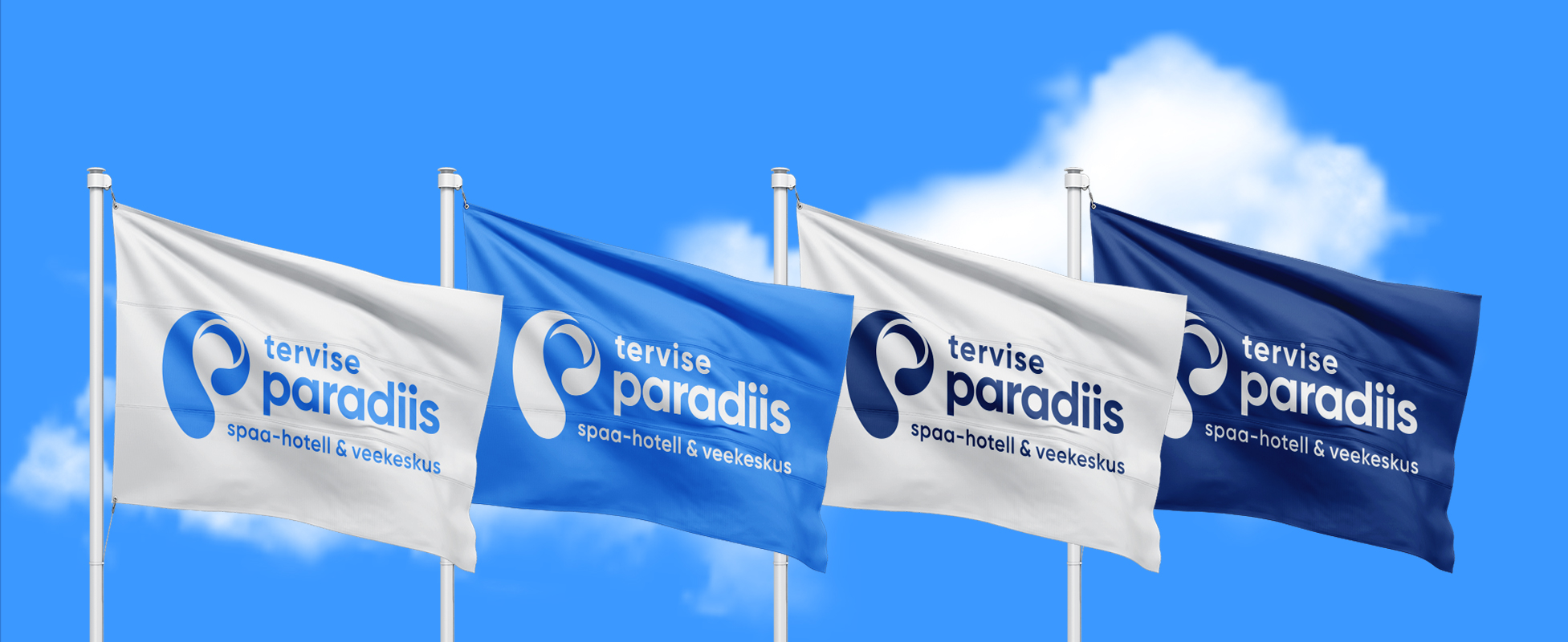 Tervise Paradiisi logo koosneb märgist ja tekstiblokist. Logo märk esitab p-tähe kujulist vee liikumist. Logo märk esitab p-tähe kujulist vee liikumist ja annab visuaalselt edasi veele omistatavaid selliseid omadusi nagu värskus, selgus, muutumine, tervis, erksusus, energia ja plastiline liikumine. Seda sõnumit toetab omalt poolt ka korporatiivsete värvide kasutus koos valgega.