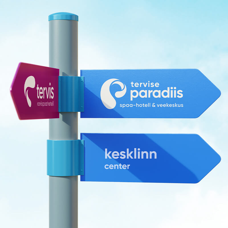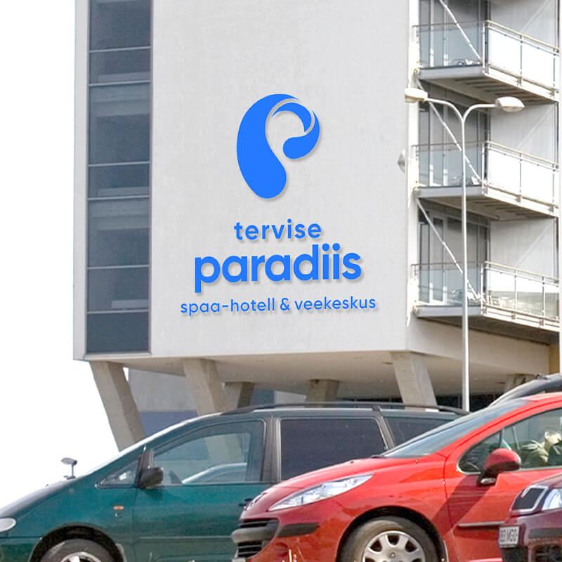 Logo märk on Tervise Paradiisi signatuur – brändi essents ja majakas. Logo märk esitab p-tähe kujulist vee liikumist ja annab visuaalselt edasi veele omistatavaid omadusi - värskus, selgus, muutumine, tervis, erksusus, energia ja plastiline liikumine.